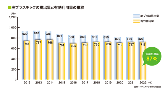 なお日本では、プラスチックのリサイクルが、年々進んでいます。2022年の有効利用率(リサイクルと熱エネルギーとして利用された廃プラスチックの合計)は、87%にのぼります。