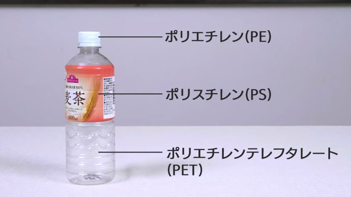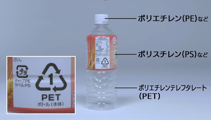 たとえばペットボトルでは、本体はポリエチレンテレフタレート(PET)、キャップはポリエチレン(PE)、ラベルはポリスチレン(PS)といった具合です。