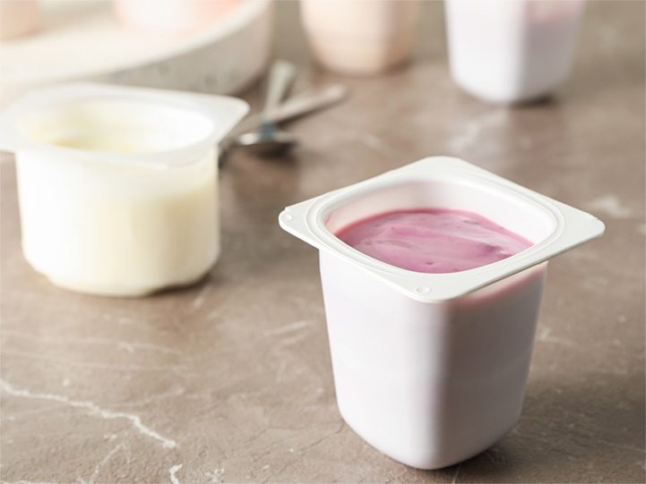 ポリスチレンには熱を加えると縮むという性質があります。この性質を利用してPETボトルなどの容器のラベルとして広く使われています。「縮む」を英語で言うとシュリンクなので、シュリンクフィルムと呼ばれます。シュリンクフィルムを使った包装は容器全体を覆うことができるため、商品を保護したり、異物が入り込んだりすることを防ぐ効果もあります。商品のシュリンクフィルムが破れていなければ、開封されていないと確かめることもできます。さらにカラフルな印刷もできるため、飲み物のラベルや調味料のキャップ包装などに利用されます。