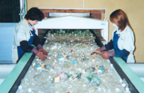 (1)選別:ラベルなどちがう種類のプラスチック、色のついたボトル、金属類などを取りのぞきます。